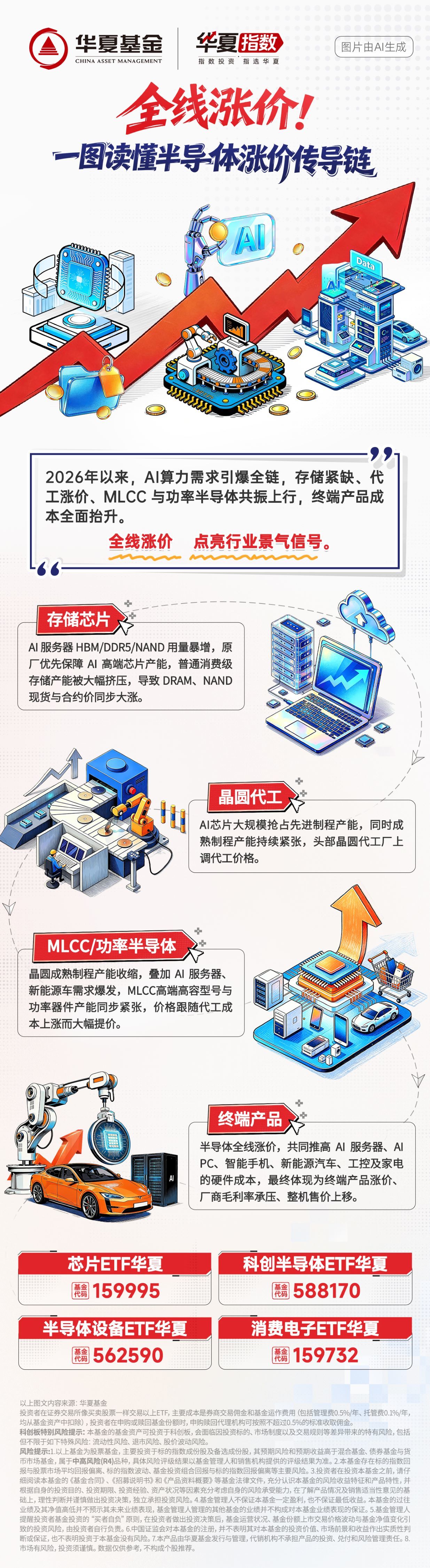 半导体设备ETF华夏(562590)及其联接基金(A类:020356;C类:020357):跟踪中证半导体材料设备主题指数,其中半导体设备的含量在全市场指数中最高(约63%),直接受益于全球芯片涨价潮对“卖铲人”(设备商)的确定性需求。